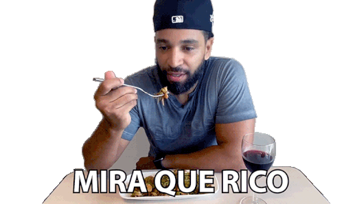 Henry Santos enjoys a delicious meal with a glass of wine, exclaiming 'Mira Que Rico' (Look How Delicious).