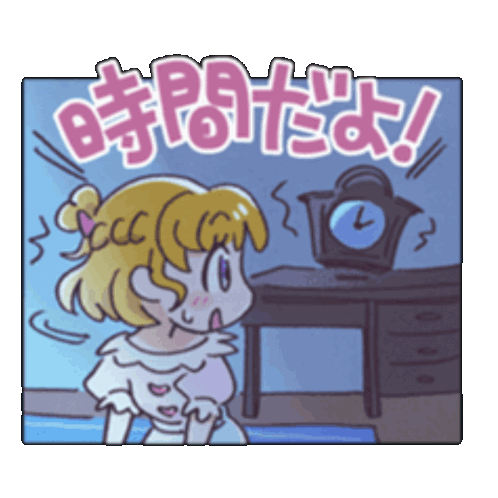 a cartoon drawing of a girl looking at a clock with the words " 時間 だ よ ! " written above her