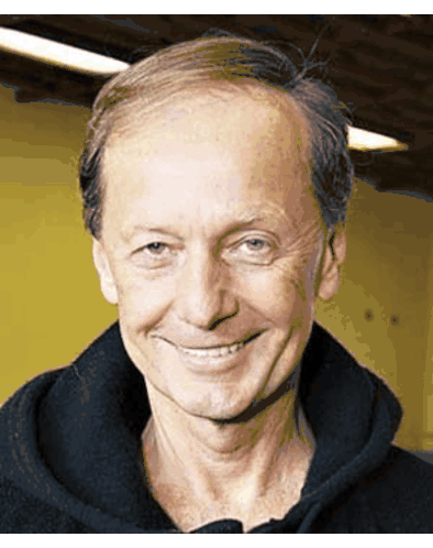 a close up of a man 's face smiling and wearing a black sweater .