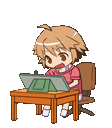 Misaki Kamiigusa, the creative artist from Sakurasou, animated in charming pixel art, sitting at her desk with a tablet.