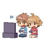 two cartoon characters are playing a video game together .