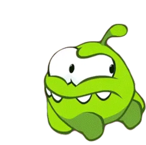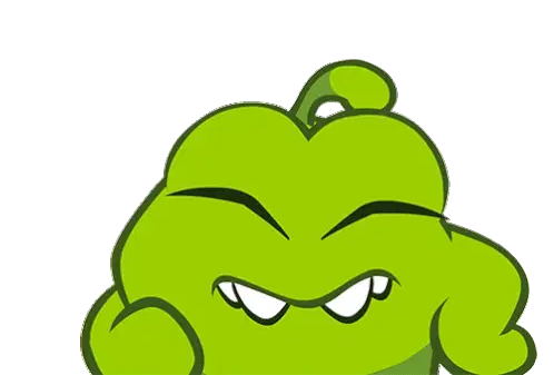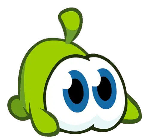 Om Nom, the adorable green creature from Cut the Rope, lets out a mischievous laugh, seemingly hiding or scheming.