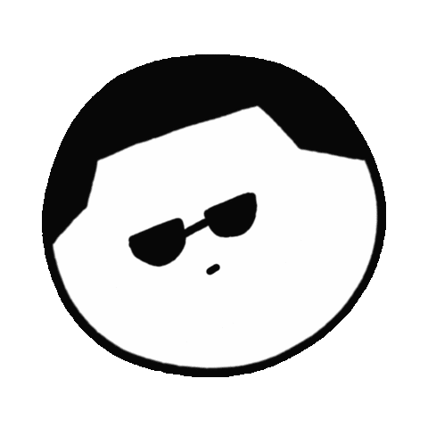 A minimalist cartoon face with sunglasses and a smug smile performs a mischievous "tada" gesture.