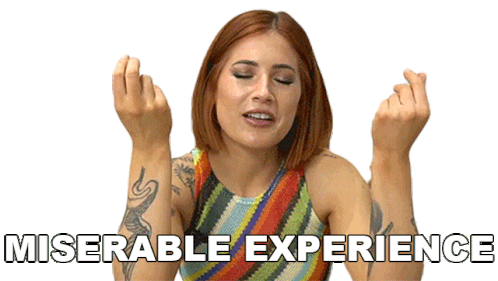 Candice Hutchings expresses a miserable experience with a shrug and hand gestures, conveying frustration.