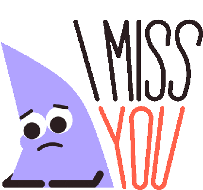 A light purple triangle character with a sad expression and downturned eyes, accompanied by the text 'I MISS YOU'.