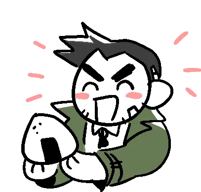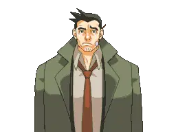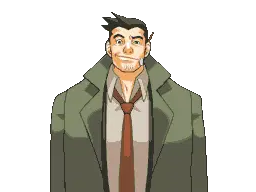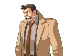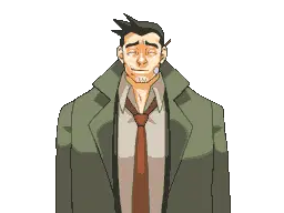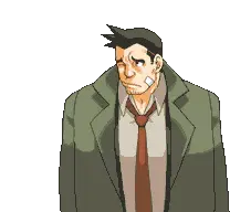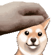 Animated pixel art sticker of Missile the Shiba Inu being petted by Gumshoe from Ace Attorney, showing pure joy.