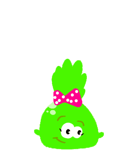 Missy Babytv, a cute green blob character, winks playfully while wearing a stylish pink polka-dot bow.
