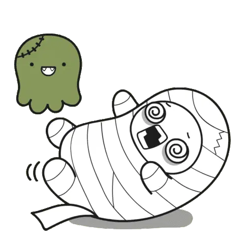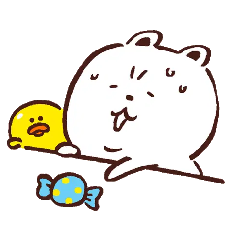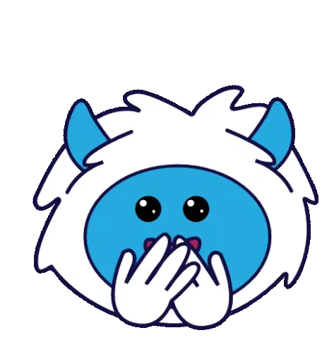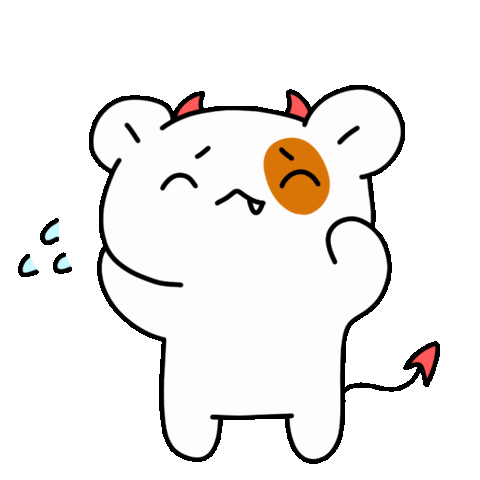 A cute white cow-like devil character with red horns looks embarrassed and apologetic, with sweat drops. Expresses "my bad" or "oops."