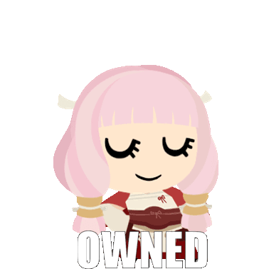Mitama from Fire Emblem reacts with a distressed expression as the word 'Owned' appears, a funny animated sticker.