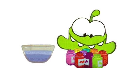 Om Nom, the green monster, happily mixes colorful paints from various bottles into a bowl, creating a new color.