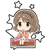 Miyabi Tsukimiya from Idolmaster, a cute chibi character, sits on a bench, looking at her smartphone with stars around her.