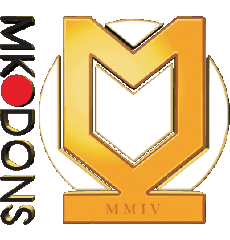 A golden 3D rotating logo for MK Dons, featuring the club's emblem and 'MMIV' text, set against a white background.