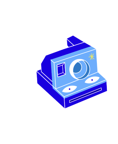An animated Mlnbgr sticker featuring a blue isometric Polaroid camera that prints a photo with a vibrant blue heart.