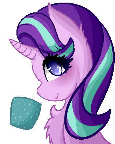 Starlight Glimmer, a light purple unicorn pony with a vibrant purple and teal mane, holds a teal cube.