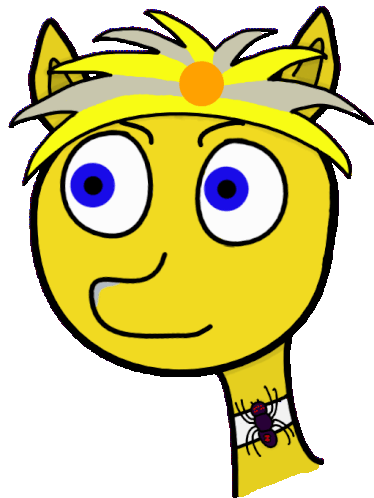 A cute yellow cartoon pony character with a headband and spider detail on its neck performs a playful blep, sticking out its tongue.
