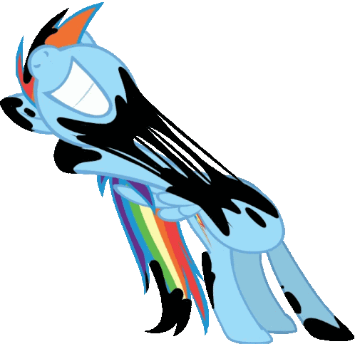An animated pixel art MLP-style blue pony with a vibrant rainbow mane and tail, adorned with black speckles, subtly moves.