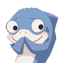 A cute cartoon shark with big eyes and a wide smile, holding its fins together in a pleading or excited gesture.