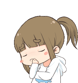 An adorable chibi girl with a ponytail ponders deeply, hand to chin, with a thoughtful or sleepy expression.