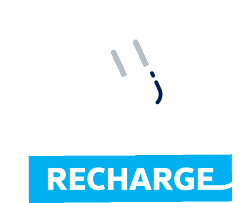 An animated sticker showing the word 'RECHARGE' appearing on a blue bar, symbolizing electric vehicle charging.