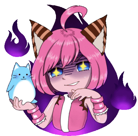 Nana from Mobile Legends Bang Bang with a mischievous, slightly scary smile, holding her blue cat companion, surrounded by purple flames.