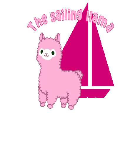 Mod Emma, a cute pink llama, stands beside a pink sailboat with the text "The sailing llama" above.