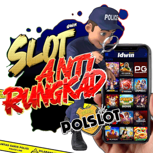 A police officer with a magnifying glass next to a phone displaying 'Idwin' slot games, promoting 'Slot Anti Rungkad'.