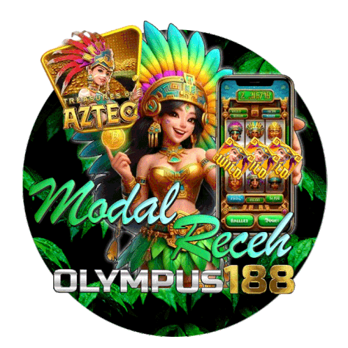 A vibrant sticker featuring a woman in Aztec attire promoting Modal Receh Olympus188 slot game, Treasures of Aztec.