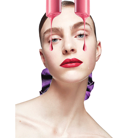 A model with a surreal beauty look, featuring pink liquid dripping from tubes above her eyes like tears, with bold red lipstick.