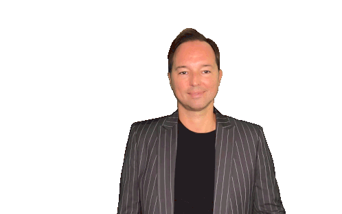 A smiling Modern Butler, dressed in a stylish pinstripe suit and black shirt, points his finger upwards.