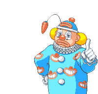 Moe, the Ace Attorney clown Lawrence Curls, points a finger up with a sad expression, wearing his blue costume.