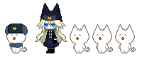 Pixel art sticker featuring a Mogekov girl in a military uniform with several cute Mogekos.