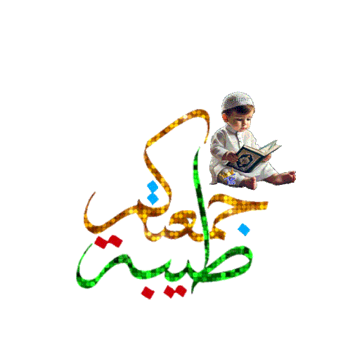 An animated sticker featuring Arabic calligraphy for 'Blessed Friday' and 'Mohamed', with a child reading a religious book and roses.