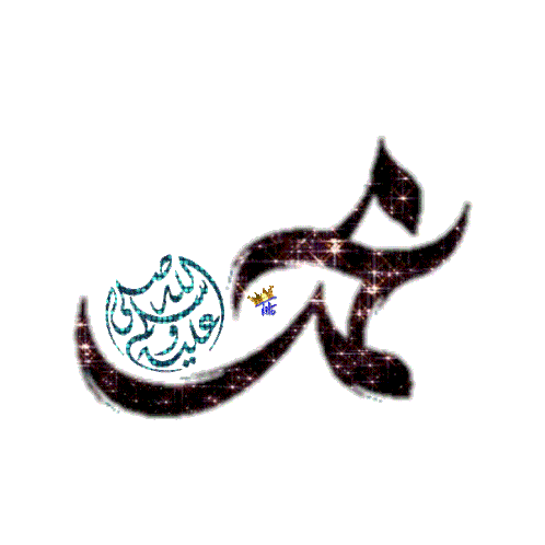 Glittering Arabic calligraphy of Prophet Mohamed's name with 'Peace be upon him' and a small crown.