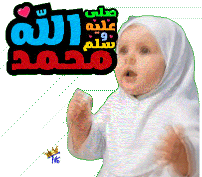Mohamed Tawfikiya features a baby in a white hijab, with vibrant Arabic calligraphy for Allah and Muhammad.