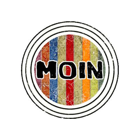 A vibrant sticker featuring the Northern German greeting 'Moin' on a distressed, colorful striped background, perfect for a cheerful hello.