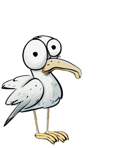 a cartoon drawing of a seagull with big eyes and a yellow beak
