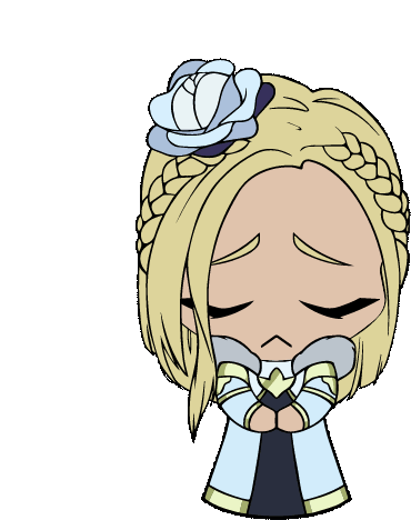 Moira from Shadow Fight, a chibi character, looks sad and worried, letting out a gentle sigh and exhale.