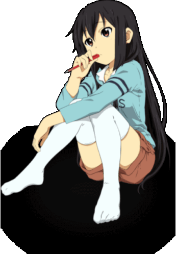 Moko, an anime girl with long black hair, sits cross-legged, holding a red pencil to her mouth with a thoughtful expression.