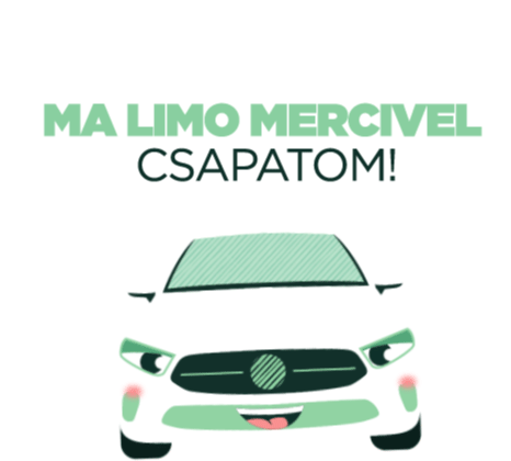A cheerful cartoon car from Mol Limo winks and smiles, displaying the text 'My Limo Mercedes Team!' in Hungarian.