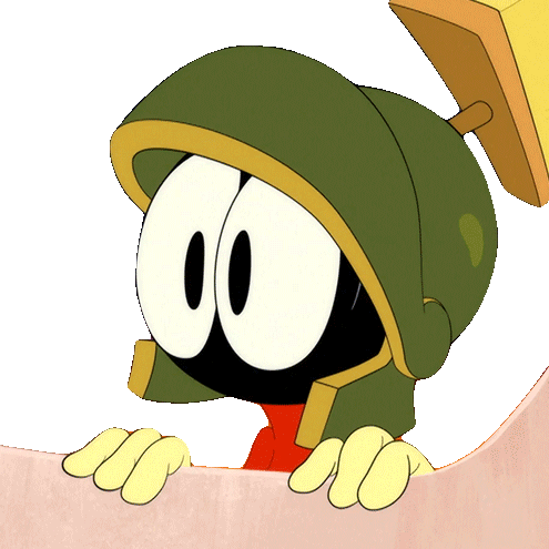 Marvin the Martian looks annoyed and then slightly less so, peeking over a surface.