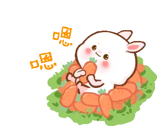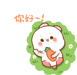 Molly the cute rabbit character waves hello while holding a carrot, lying on green grass.