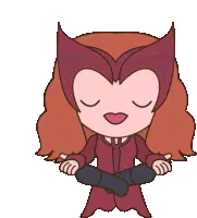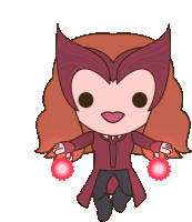 Chibi Scarlet Witch floating with powerful red magic, ready to cast a spell with glowing hands.