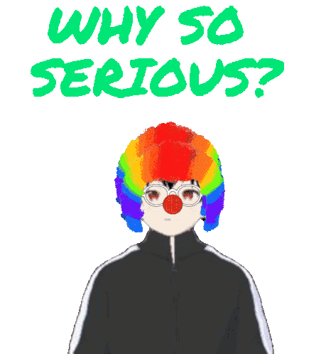 Momiji Attano dressed as the Joker, with a rainbow wig and clown nose, asking "Why So Serious?".