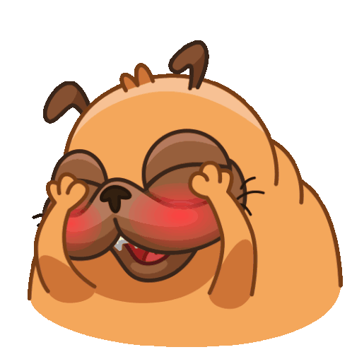 Monchi Monchi Pug laughs heartily, then covers its face with paws, blushing with embarrassment or shyness.