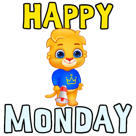 A cute Lucas and Friends lion cub shouts 'Happy Monday!' through a megaphone, spreading cheer for the new week.