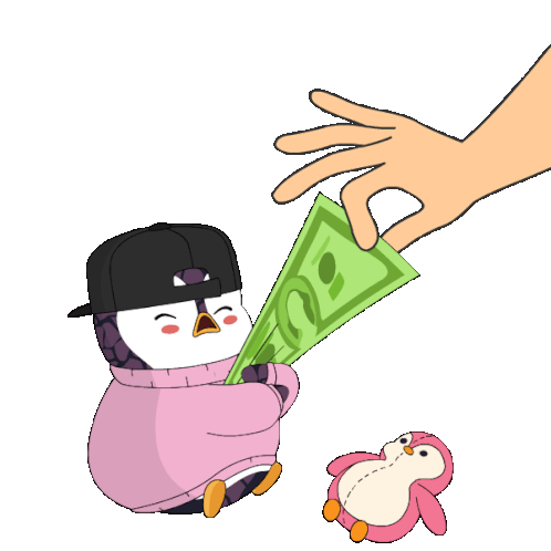 A distressed penguin in a pink sweater and cap cries while holding a dollar bill, possibly due to tax season stress.