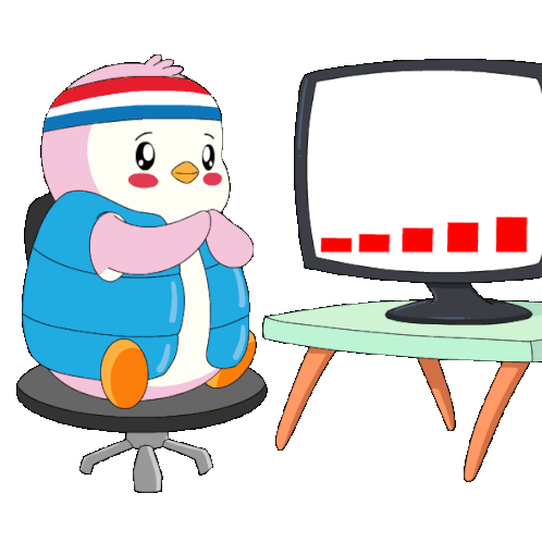 A cute cartoon penguin with a headband and vest watches a financial chart on a computer, its eyes turning into dollar signs as the graph rises.