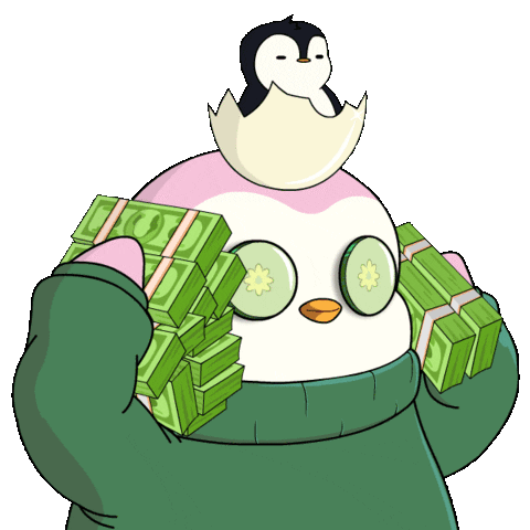 A rich penguin with cucumber eyes and a baby penguin on its head holds huge stacks of money.