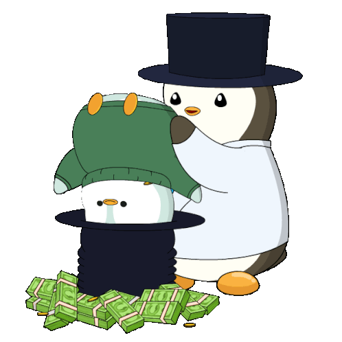 A large Pudgy Penguin in a top hat holds a smaller penguin over a pile of money, symbolizing expenses and taxes.