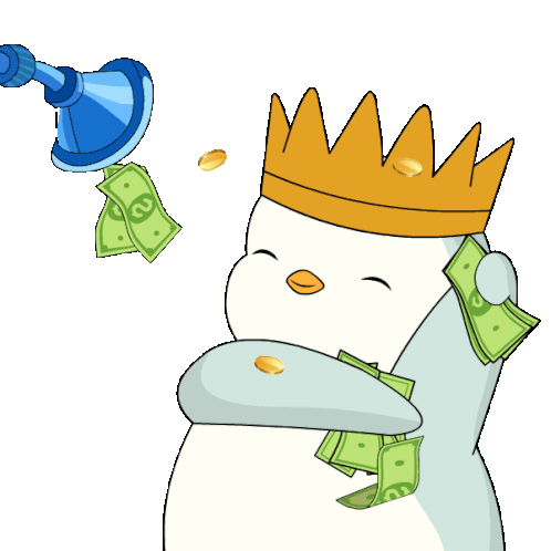 A happy penguin king, wearing a golden crown, gets showered with crypto money and coins.